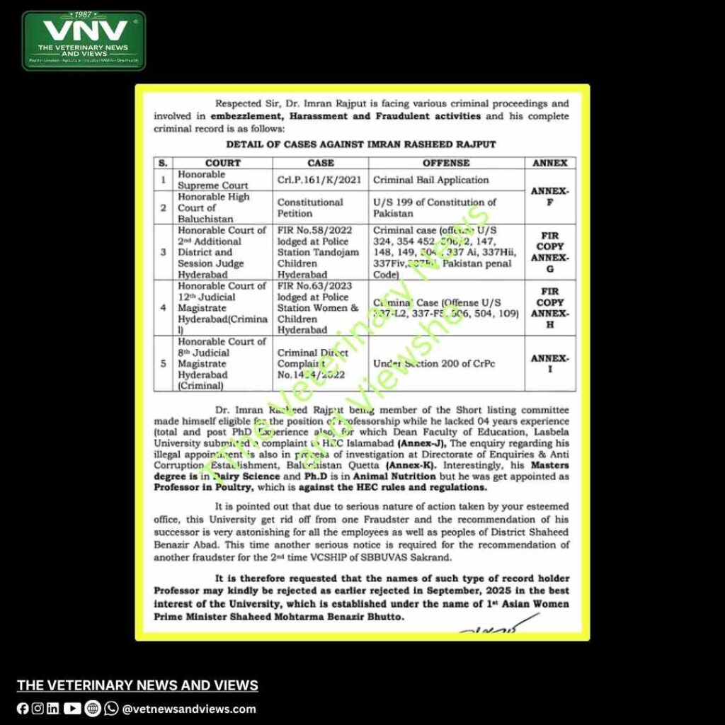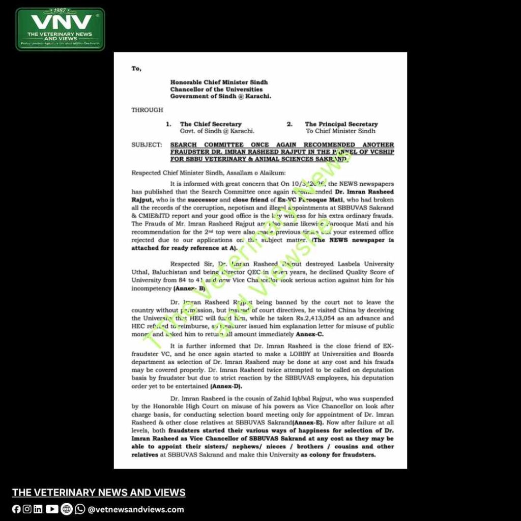 شہید بینظیر بھٹو یونیورسٹی آف ویٹرنری اینڈ اینیمل سائنسز (SBBUVAS) سکرنڈ میں وائس چانسلر کی تعیناتی کا عمل شدید تنازع کا شکار ہو گیا ہے، جہاں ایک امیدوار کی دوبارہ سفارش پر مختلف حلقوں کی جانب سے سنگین اعتراضات سامنے آئے ہیں اور ان کی نااہلی کے لیے باضابطہ درخواست دائر کر دی گئی ہے۔