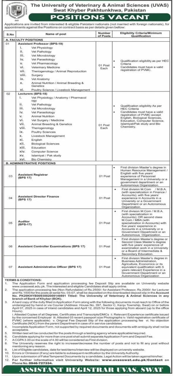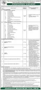 Job Opportunities at The University of Veterinary & Animal Sciences (UVAS), Swat!