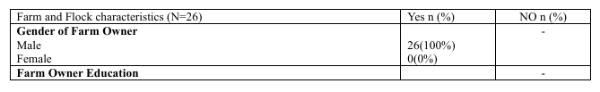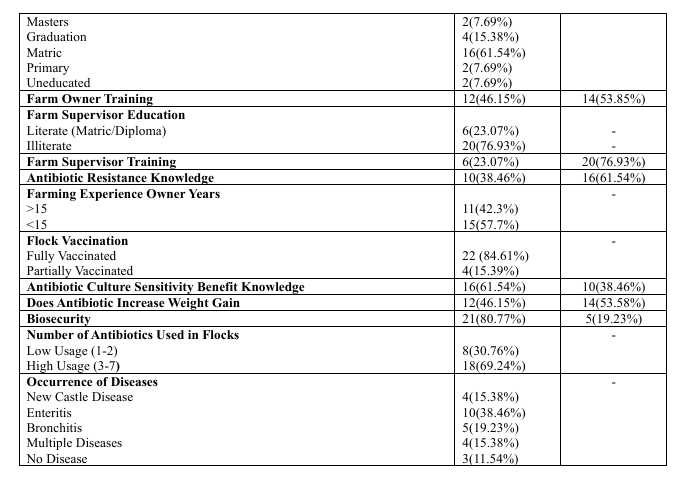 The flock and farm characteristics of the surveyed farm (N=26) reveal crucial operational and demographic insights. All the farmers were male (100%), with the majority (61.54%) having completed education equal to matriculation. Table 2 further demonstrates the execution of biosecurity practices (80.77%) and full flock vaccination (84.61%) across most farms. Additionally, the table also provides statistics on farmer experience, antimicrobial resistance awareness knowledge, and the prevalence of common infections or diseases on farms such as bronchitis, enteritis and new castle disease.
