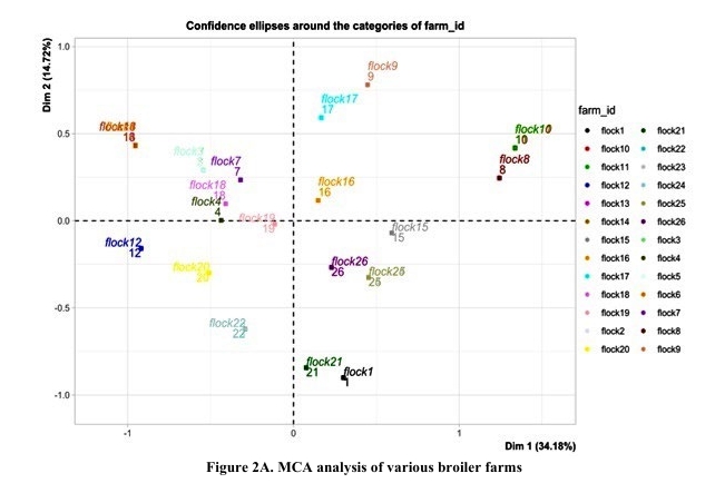 Data Management and Analysis: Data sheets, prepared by using Microsoft Excel 2016 and RStudio IDE (version 2024.09.1, Build 394) were used for further univariate and multivariate analysis. Univariate analysis was performed on weight gain, mortality and antibiotic usage, whereas multivariate analysis, including MCA on management-related categorical variables and cluster analysis on weekly flock performance data. To ensure standardized data collection using a structured questionnaire across all farms, with consistent variables defined.