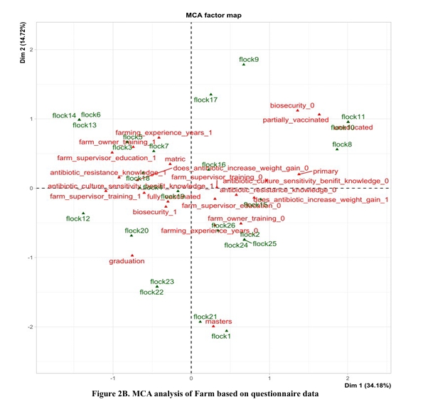 uneducated have a correlation coefficient of 2.005 which is particularly linked with less suitable farming practices. Moreover, individuals with high education backgrounds like graduates (-0.754), and master’s degree holders with a correlation coefficient of (0.284) are aligned with more positive results. The second dimension further explains practices related to training and knowledge such as farm owner training correlation. Those without training correlate to -0.510 and those who got the training correlate to 0.595 whereas farm supervisor education significantly influences such practices with a c correlation of -0.154 for uneducated and 0.514 for educated. Particularly, a high correlation was found for those who have better knowledge about antibiotic resistance with a correlation of -0.096 no knowledge about antibiotic resistance and 0.154 correlations for those who know about antibiotic resistance.