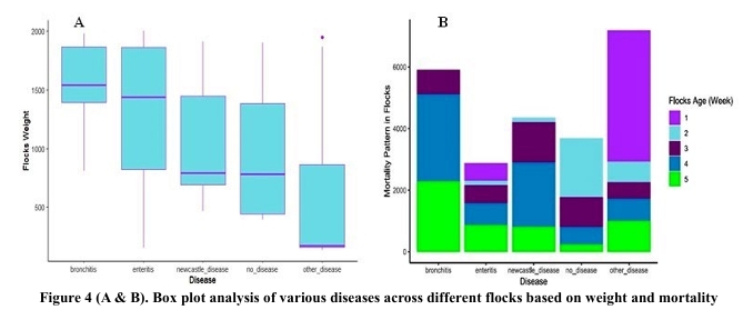 A previous study (Mahmood et al., 2024) described that due to prophylactic use of antimicrobial treatments, most of the flock were healthy during these critical stages of life. Moreover, bronchitis infection, Newcastle disease and enteritis were common after the second week. Enteritis affected the flock all over the production cycle, with high feeding rate and associated metabolic issues likely contributed to this condition. These findings emphasize the importance of proper antibiotic use, improved flock management practices, farmer education and training and implementation of policies through effective legislation, all of which are essential for reducing the risk of illness, improving flock health and