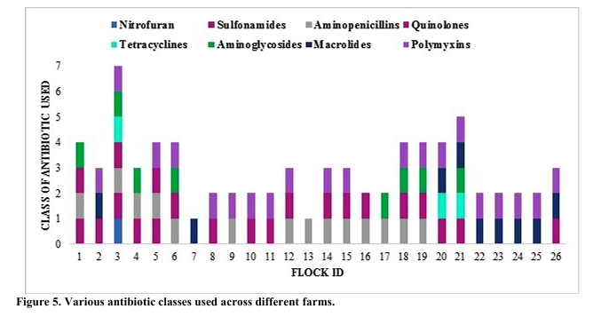 The number of antibiotic classes used in flocks ranged from 2-7 with highest observed diversity in flock 3 and flock 21, each receiving antibiotics from 7 and 5 different classes, respectively, including polymyxins, sulfonamide, tetracyclines, macrolides and quinolones. Notably, polymyxins (e.g., colistin) were commonly used in several (76.92%) flocks, despite their classification as a last resort antibiotic for prophylaxis and treatment of flocks.