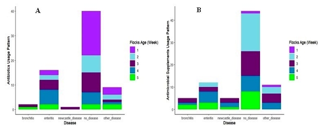 Figure 6 (A & B). Antibiotics and antimicrobial supplements are used in flocks during different weeks and for different diseases