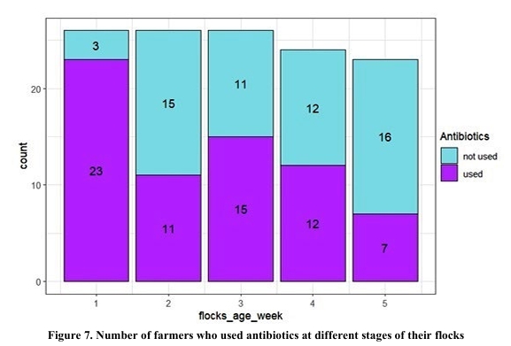 Antibiotic usage patterns were monitored across flocks during week 1 to week 5 of the broiler production cycle. The data revealed that antibiotics were most frequently administered during the first and third week of production. As a prophylactic measure, farmers used antibiotics from the first week of life (88.46%). The usage of antibiotics then decreased to (42.30%) in the second week, (57.69%) in the third week, (50%) in the 4th week while in 5th week (30.43%) (Figure 7).