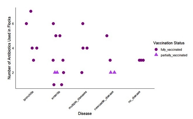 The usage of antibiotics in different flocks concerning vaccination status and occurrence of diseases. During the occurrence of bronchitis and Newcastle disease, especially in viral outbreaks (26.92%) of farmers used more than two antibiotics and their flocks were fully vaccinated. In enteritis, farmers used multiple antibiotics for the treatment (Figure 8).