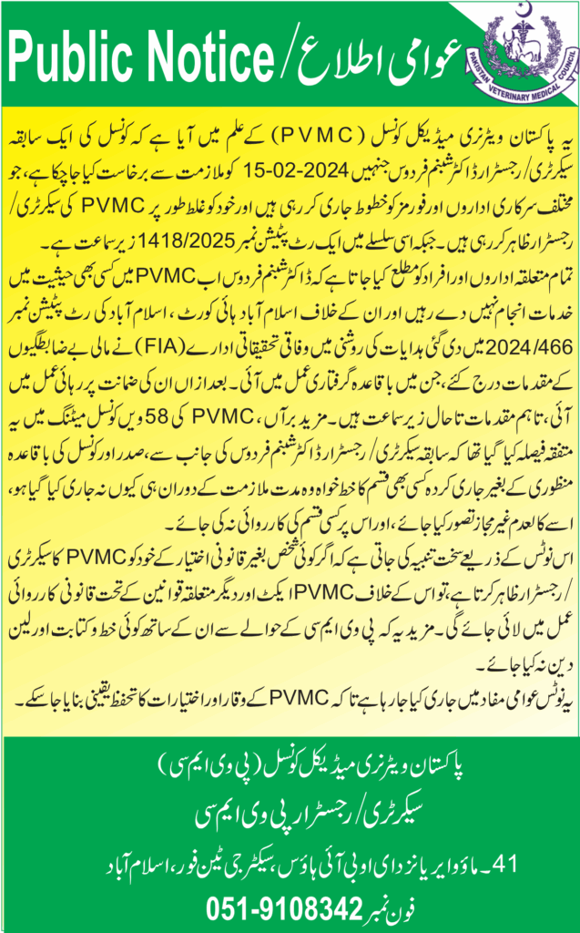 اسلام آباد — پاکستان ویٹرنری میڈیکل کونسل (PVMC) نے ایک اہم عوامی نوٹس جاری کرتے ہوئے عوام الناس، تعلیمی اداروں، اور متعلقہ شعبہ جات کو خبردار کیا ہے کہ سابق رجسٹرار/سیکرٹری ڈاکٹر شبنم فردوس، جو 15 فروری 2024 کو پی وی ایم سی کی ملازمت سے برطرف ہو چکی ہیں، اب بھی غیر قانونی طور پر خود کو PVMC کا رجسٹرار/سیکرٹری ظاہر کر رہیہیں اور جعلی خطوط جاری کر رہی ہیں۔